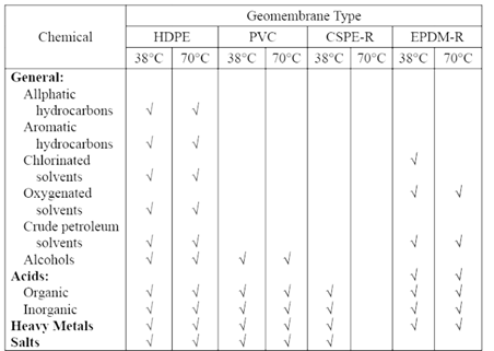 جدول ۱: راهنمای کلی مقاومت شیمیایی ژئوممبران‌های رایج(Koerner, 2012)