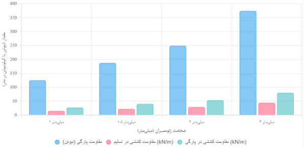 با افزایش ضخامت ژئوممبران، مقاومت آن در برابر پارگی و آسیب‌های مکانیکی به طور قابل‌توجهی بهبود می‌یابد (شکل ۱۰)، که این امر آن را برای کاربرد در پروژه‌هایی با بارگذاری‌های سنگین مناسب‌تر می‌سازد. با این حال، انتخاب ضخامت مناسب بر اساس شرایط بارگذاری پروژه و اجرای دقیق فرآیند نصب توسط نیروی متخصص، به‌ویژه در نقاط حساس مانند درزها و زوایا، از الزامات کلیدی برای تضمین عملکرد درازمدت و دوام ژئوممبران محسوب می‌شود.