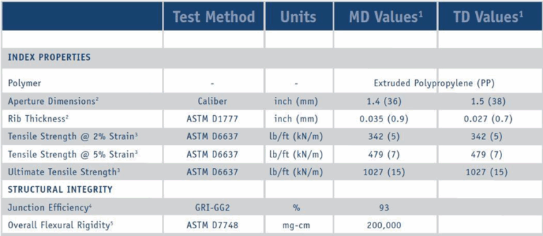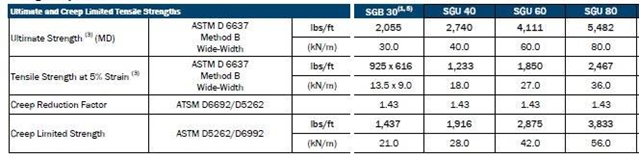 Key Design Parameters: Ultimate tensile strength in both directions (Tult,x and Tult,y) as well as geogrid performance at 2% and 5% strain.