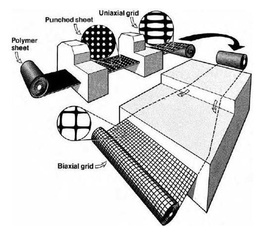 In this method, a polymer sheet (typically polyethylene (PE) or polypropylene (PP)) is punched into a grid pattern and then stretched in one or two directions.
